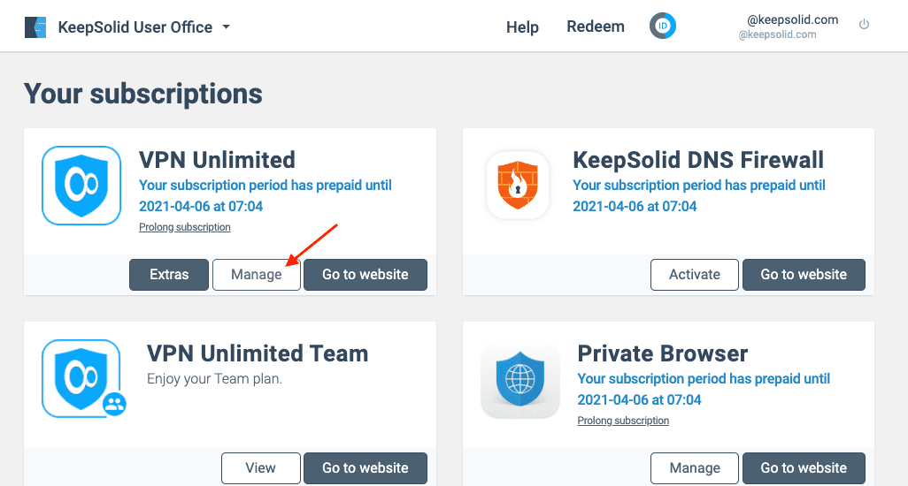 1. Melden Sie sich in Ihrem Nutzerbüro an, wählen Sie die Anwendung VPN Unlimited und klicken Sie auf Verwalten.