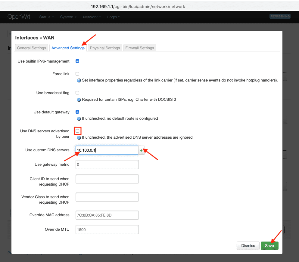 1. Gehen Sie zur Registerkarte Interface > WAN > klicken Sie auf Bearbeiten > wählen Sie die Registerkarte Advanced Settings (Erweiterte Einstellungen). Deaktivieren Sie die Option Use DNS servers advertised by Peers (Von Peers beworbene DNS-Server verwenden), fügen Sie die DNS-Details aus dem Nutzerbüro ein, und drücken Sie das +-Zeichen.