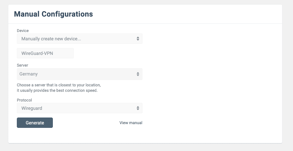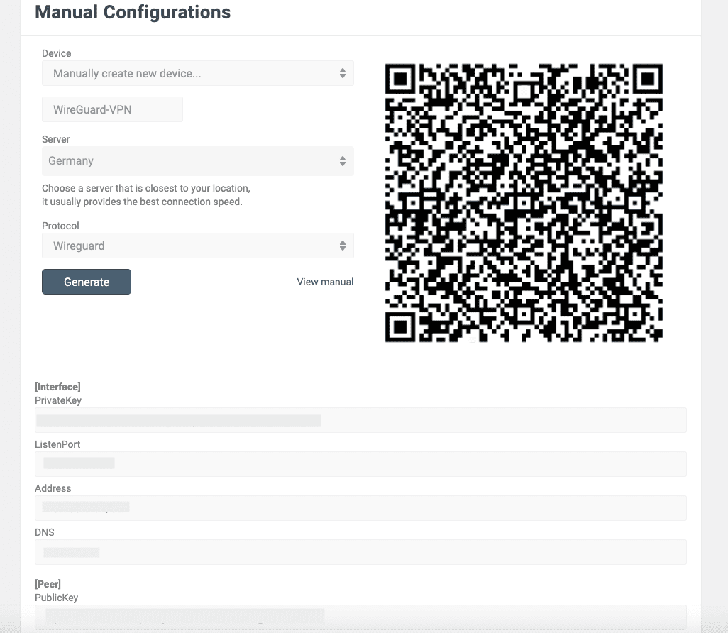 3. Drücken Sie auf Generate (Erstellen) und Sie erhalten alle erforderlichen Daten für die Einrichtung einer VPN-Verbindung.