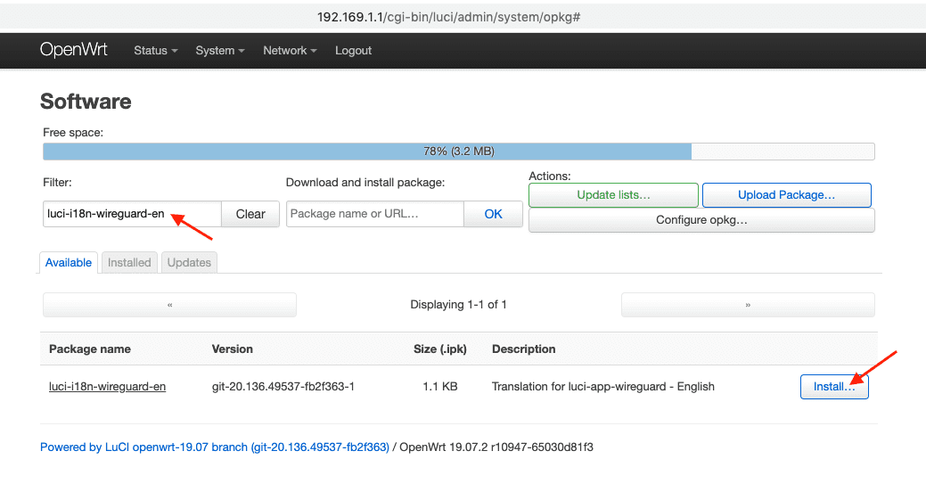 4. Geben Sie luci-i18n-wireguard-en in das Suchfeld ein und drücken Sie auf Install (Installieren).
