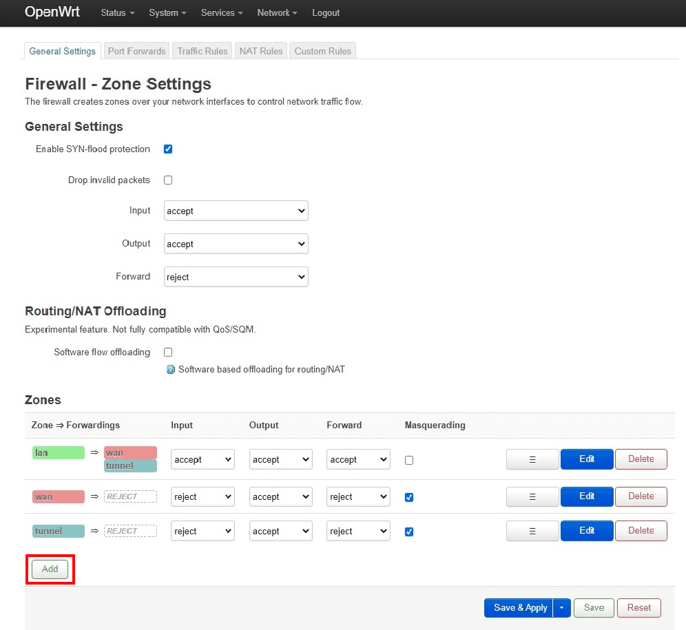 1. Navigiere zu Network > Firewall Zone Settings (Netzwerk - Einstellungen für die Firewall-Zonen) und klicke auf Add (Hinzufügen).
