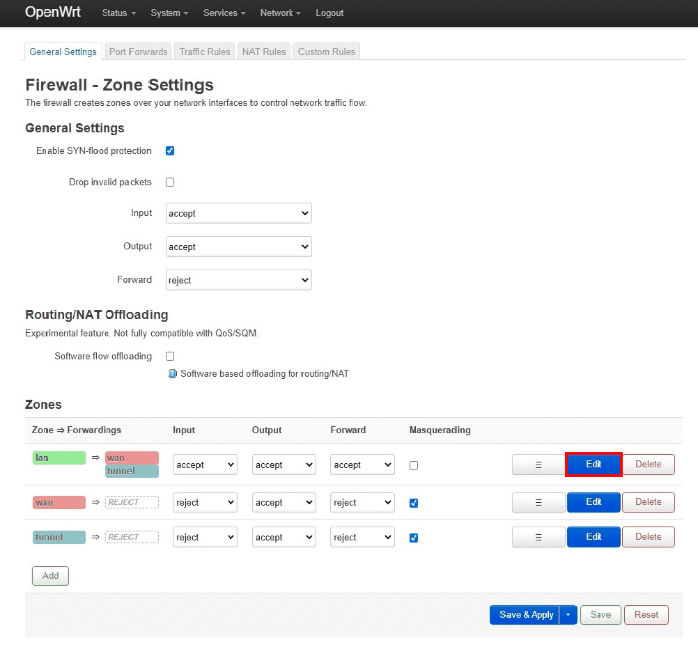 1. Navigiere zu Network > Firewall (Netzwerk > Firewall) und klicke bei „LAN Firewall-Zone “ auf Edit (Bearbeiten).