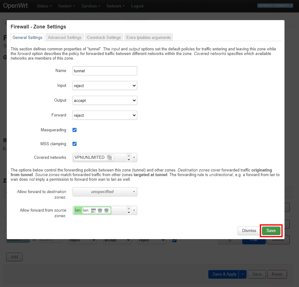 - Covered networks - wähle den zuvor erstellten VPN-Tunnel aus Interface (z.B. VPNUNLIMITED)