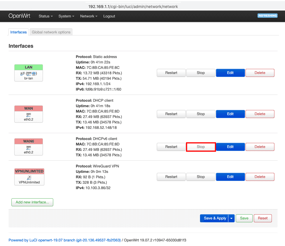 5. Drücke den Stop (Stopp)-Button bei der WAN6 Schaltfläche.