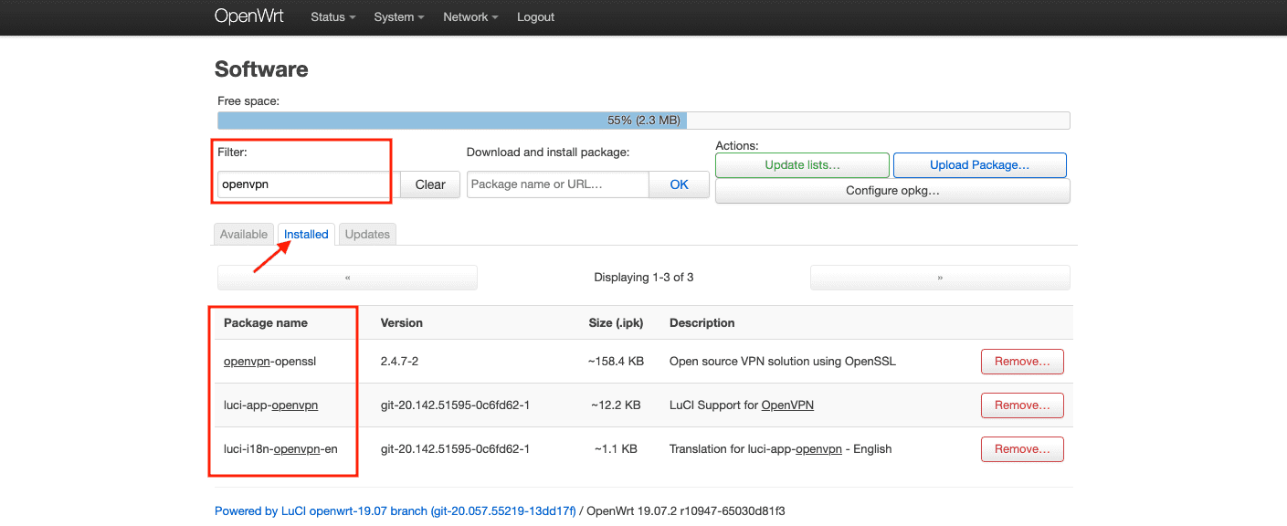 8. Vergewissern Sie sich, dass alle Pakete erfolgreich installiert wurden. Wählen Sie dazu die Registerkarte Installed (Installiert) und geben Sie openvpn in das Feld Filter ein.