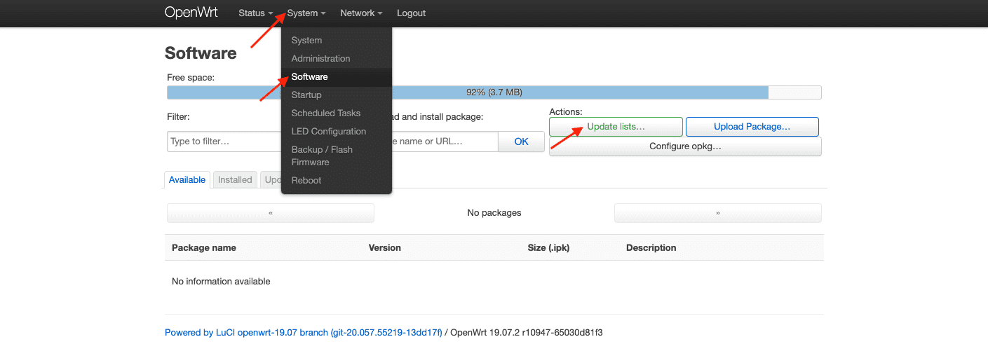 1. Gehen Sie zu System > Software (System > Software) und klicken Sie auf Update lists (Listen aktualisieren).