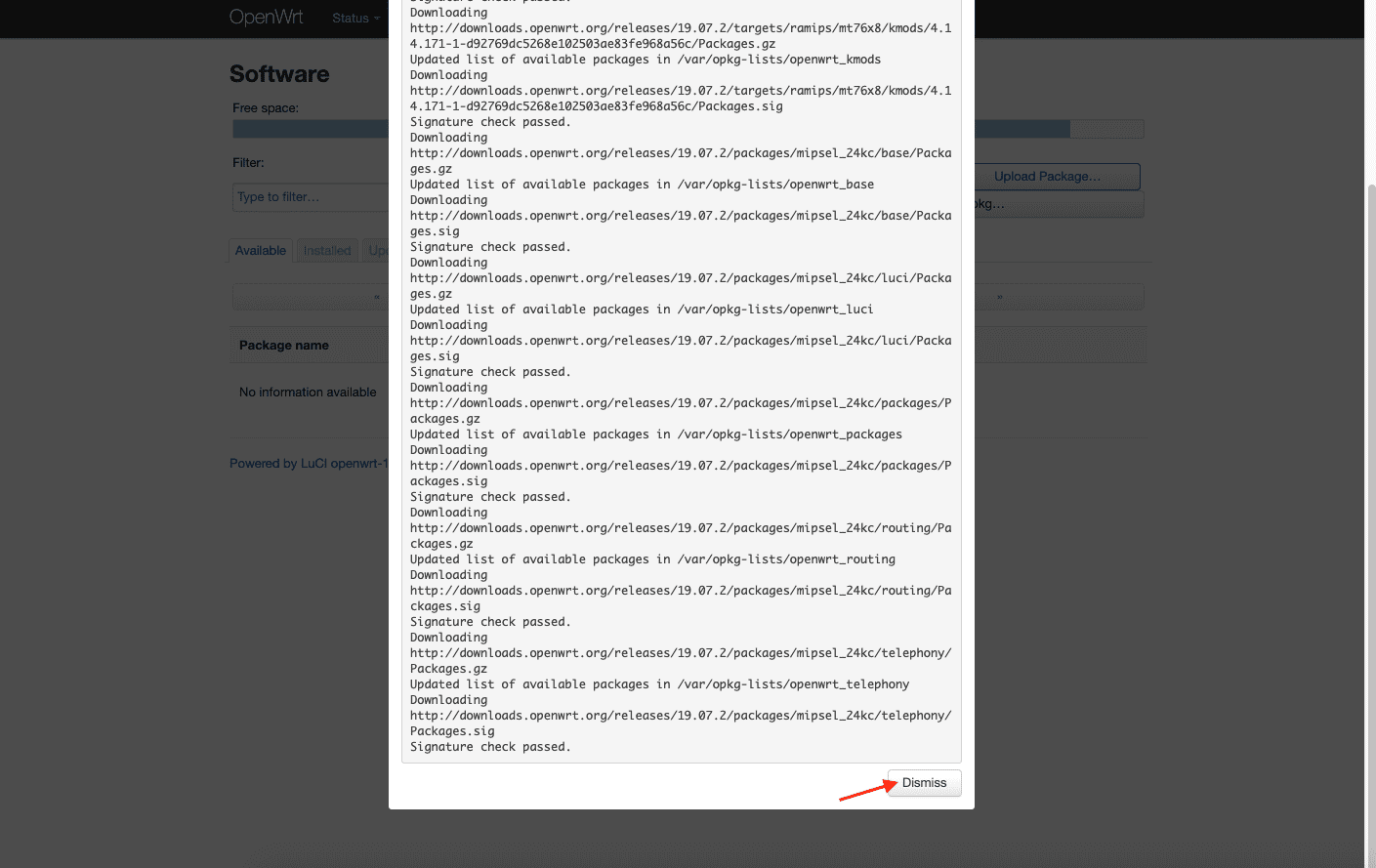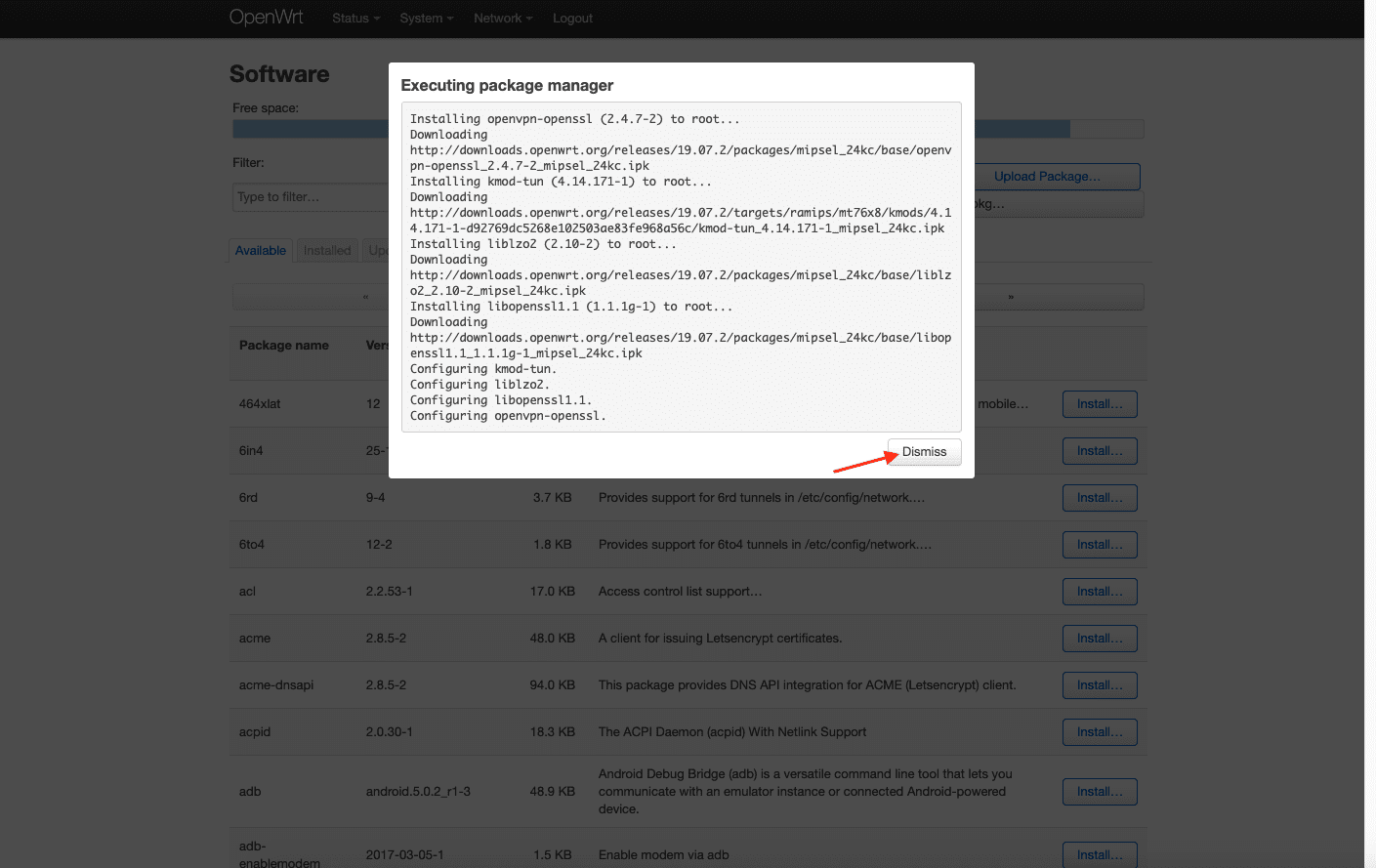 7. Warten Sie, bis beide Pakete installiert sind, und drücken Sie dann auf Dismiss (Beenden).
