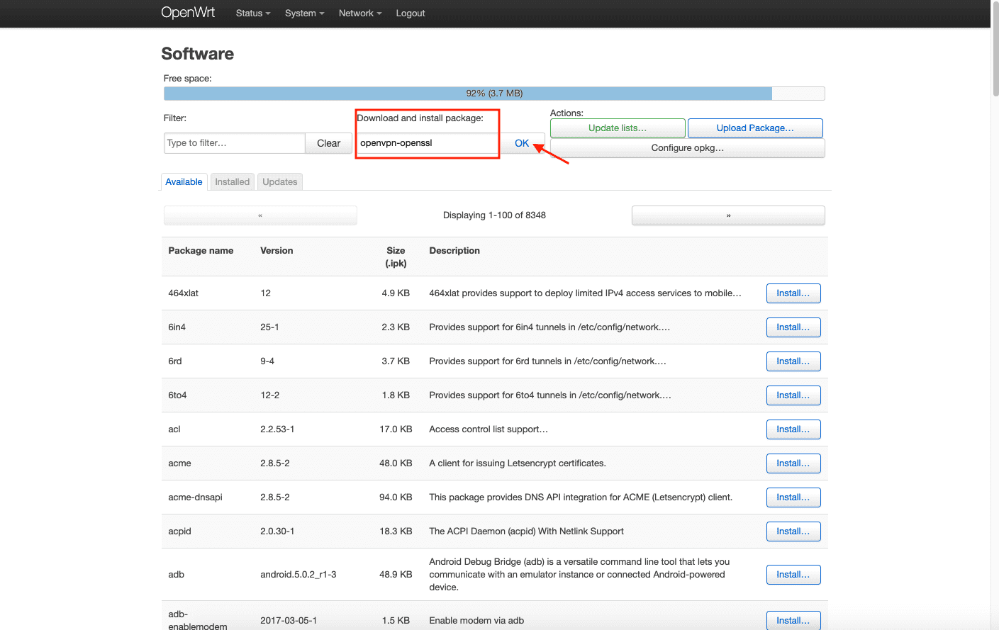 3. Geben Sie openvpn-openssl in das Feld Download and install package (Paket herunterladen und installieren) ein und drücken Sie auf OK.