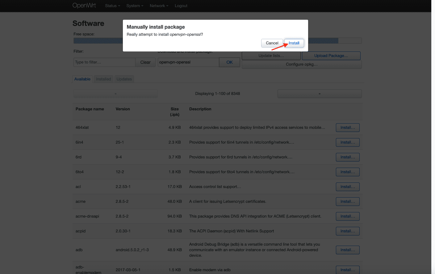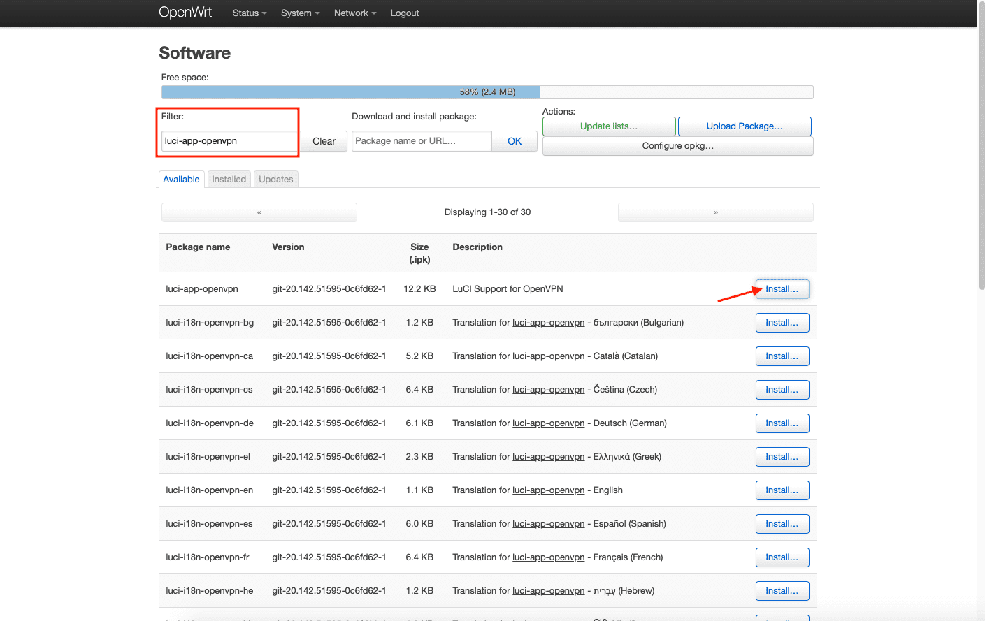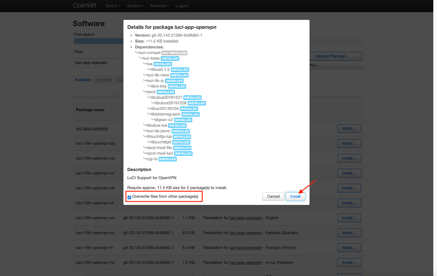 Geben Sie dann luci-i18n-openvpn-en in das Feld Filter ein und klicken Sie auf Install (Installieren).