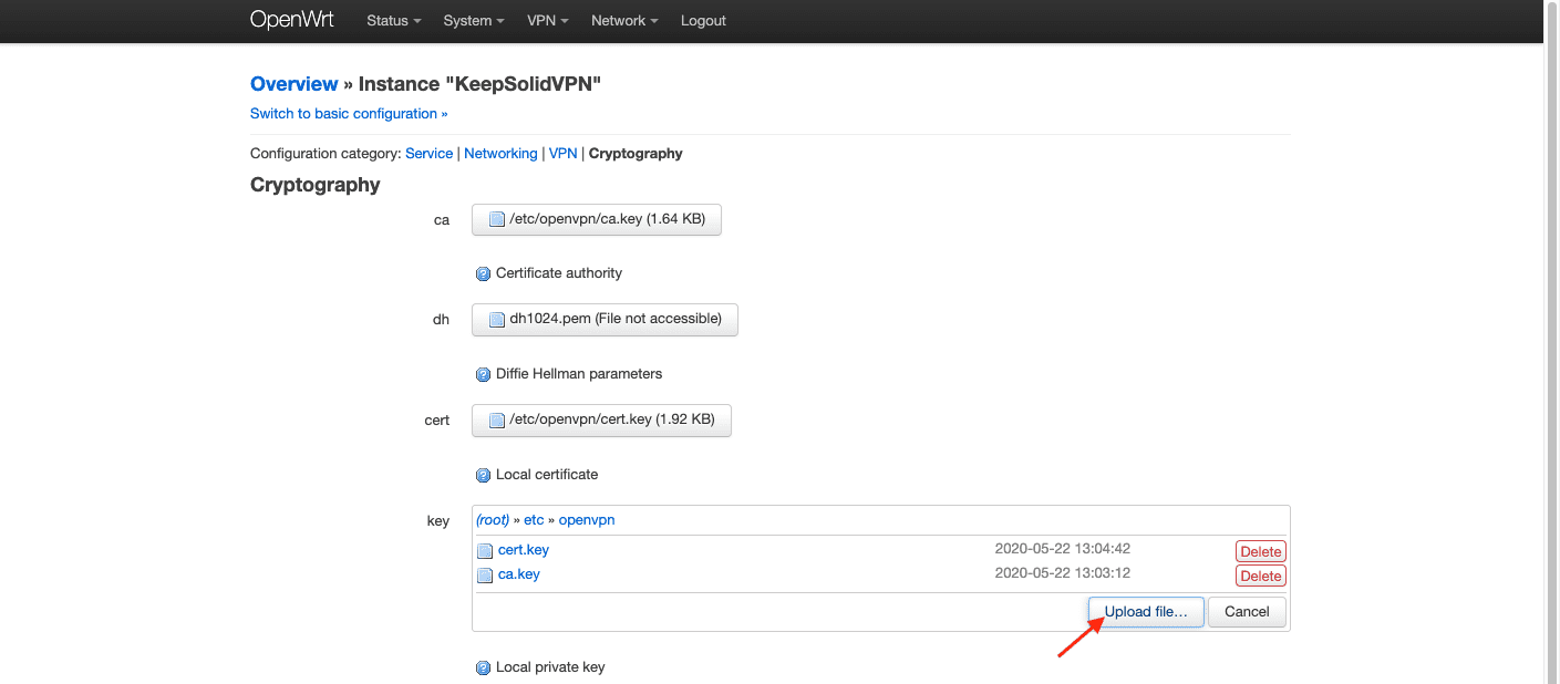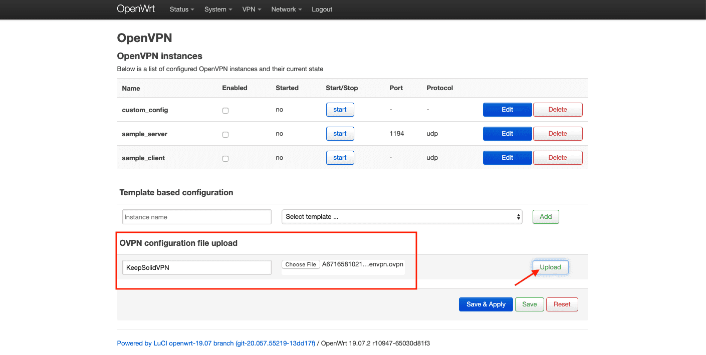 2. Suchen Sie das OVPN-Konfigurationsfeld, geben Sie einen benutzerdefinierten Namen an, z. B. KeepSolidVPN, und wählen Sie die .ovpn-Datei, die automatisch von Ihrem Nutzerbüro heruntergeladen wurde. Drücken Sie dann auf Upload (Hochladen).