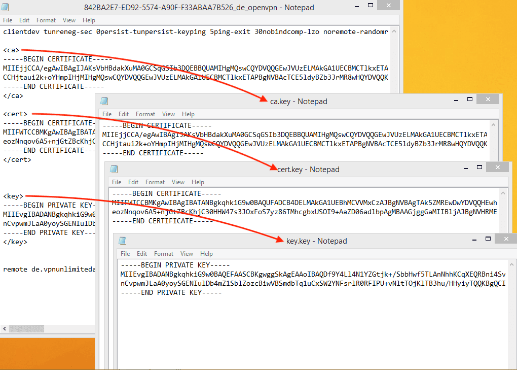 1. Öffnen Sie die Konfigurationsdatei, die automatisch auf Ihr Gerät heruntergeladen wurde, mit einem beliebigen Texteditor und erstellen Sie separate Textdateien - ca.key, cert.key, key.key. Fügen Sie die entsprechenden Daten aus der .ovpn-Datei in die entsprechende Textdatei ein.