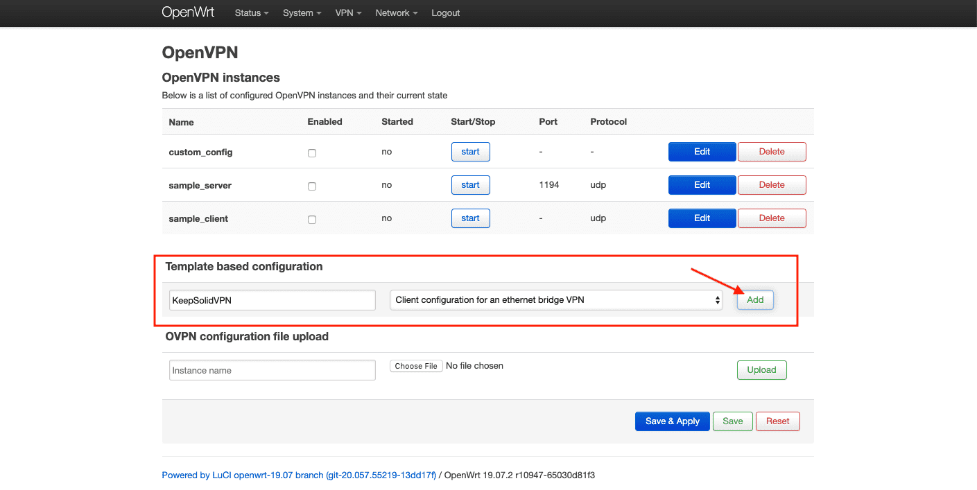 3. Geben Sie KeepSolidVPN in das Feld Configuration name (Konfigurationsname) ein, wählen Sie Client configuration for an ethernet bridge VPN (Client-Konfiguration für eine Ethernet-bridge VPN) und klicken Sie auf Add (Hinzufügen).