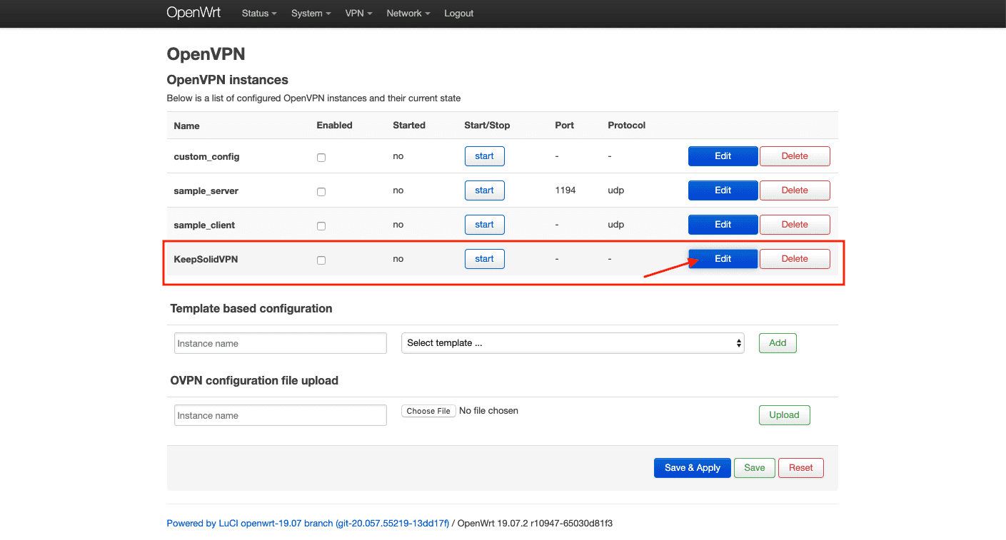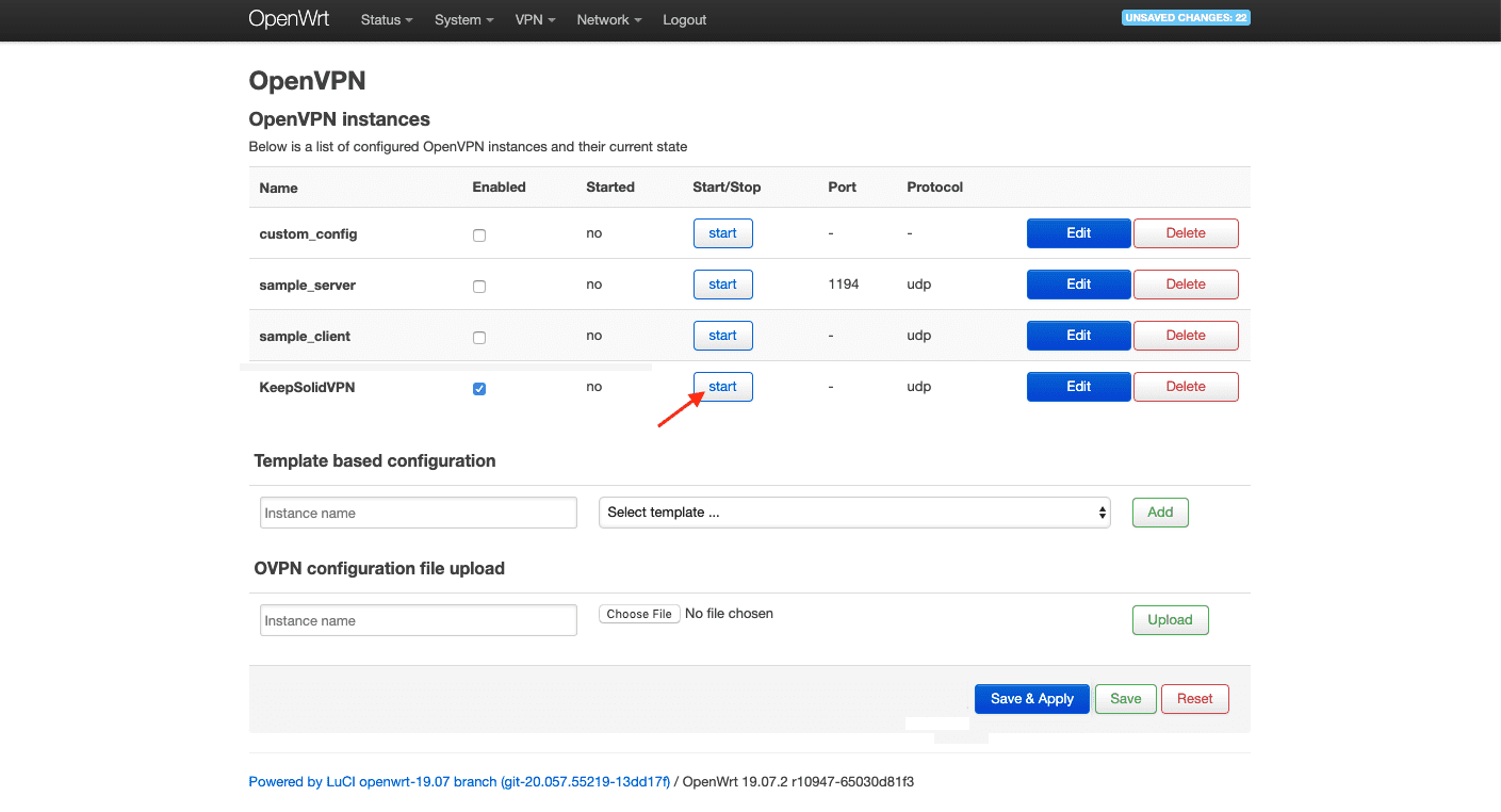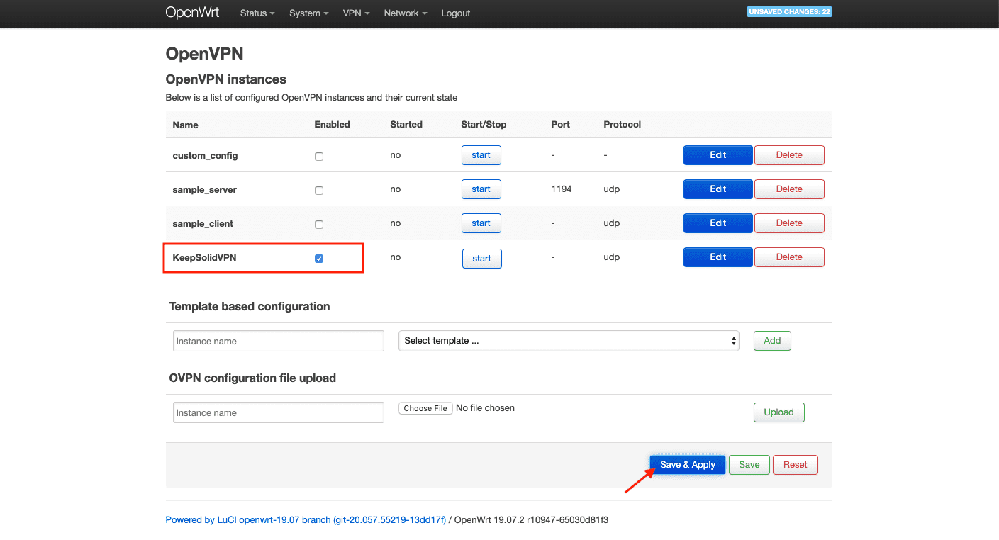 14. Markieren Sie das Kontrollkästchen Aktiviert für KeepSolidVPN und drücken Sie auf Save & Apply (Speichern & Anwenden).