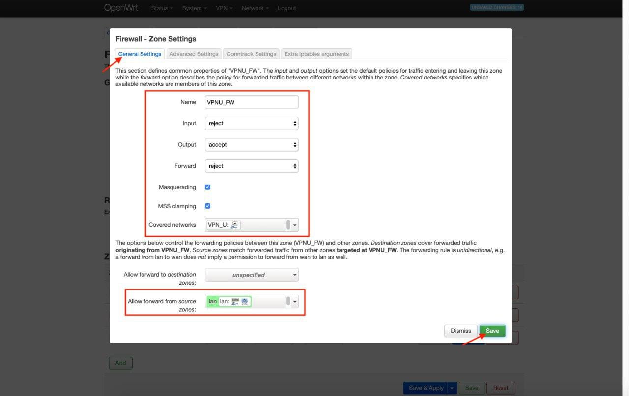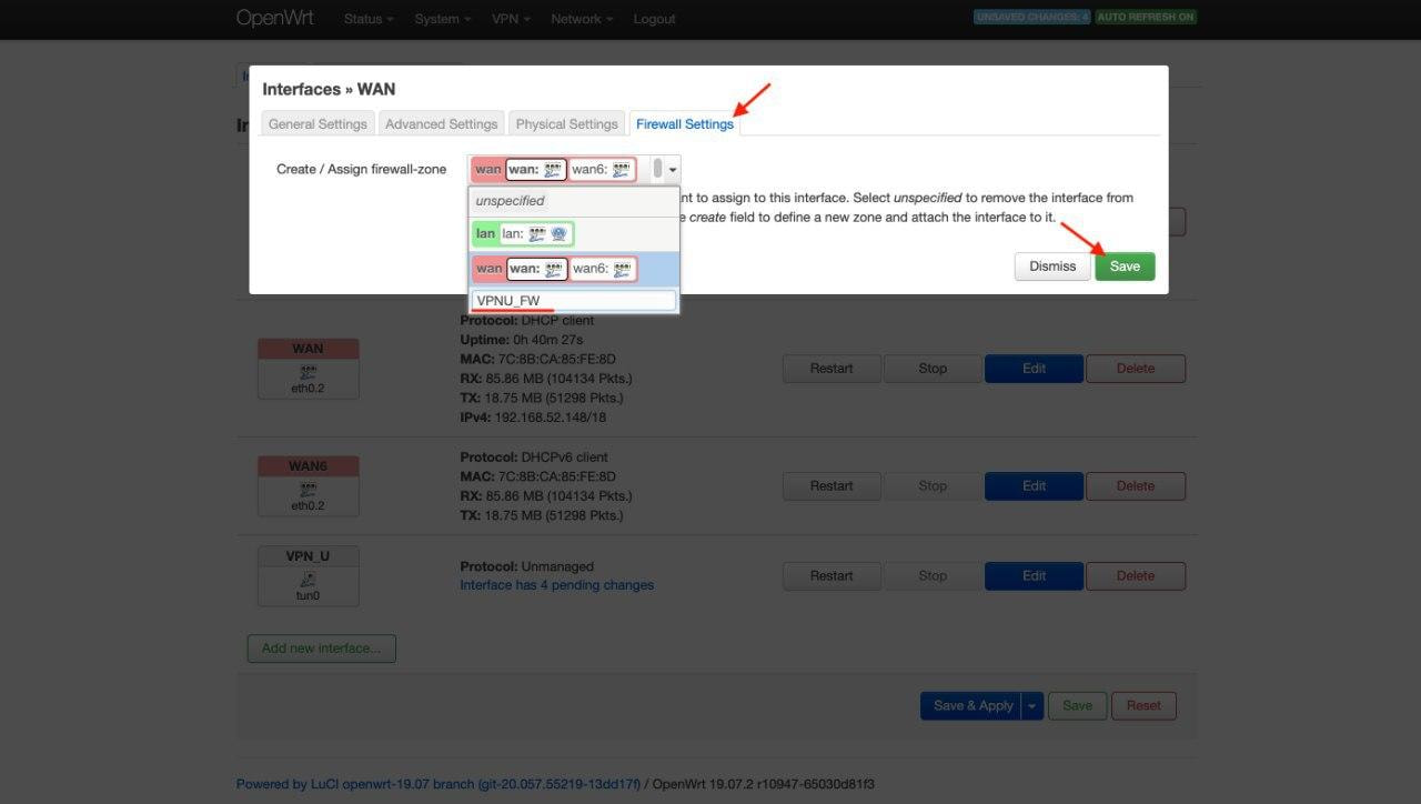 8. Geben Sie in das Feld Create / Assign firewall-zone (Firewall-Zone erstellen/zuweisen) den Eintrag VPNU_FW ein.
