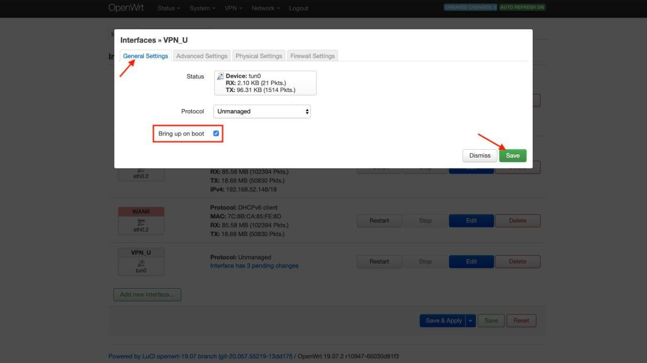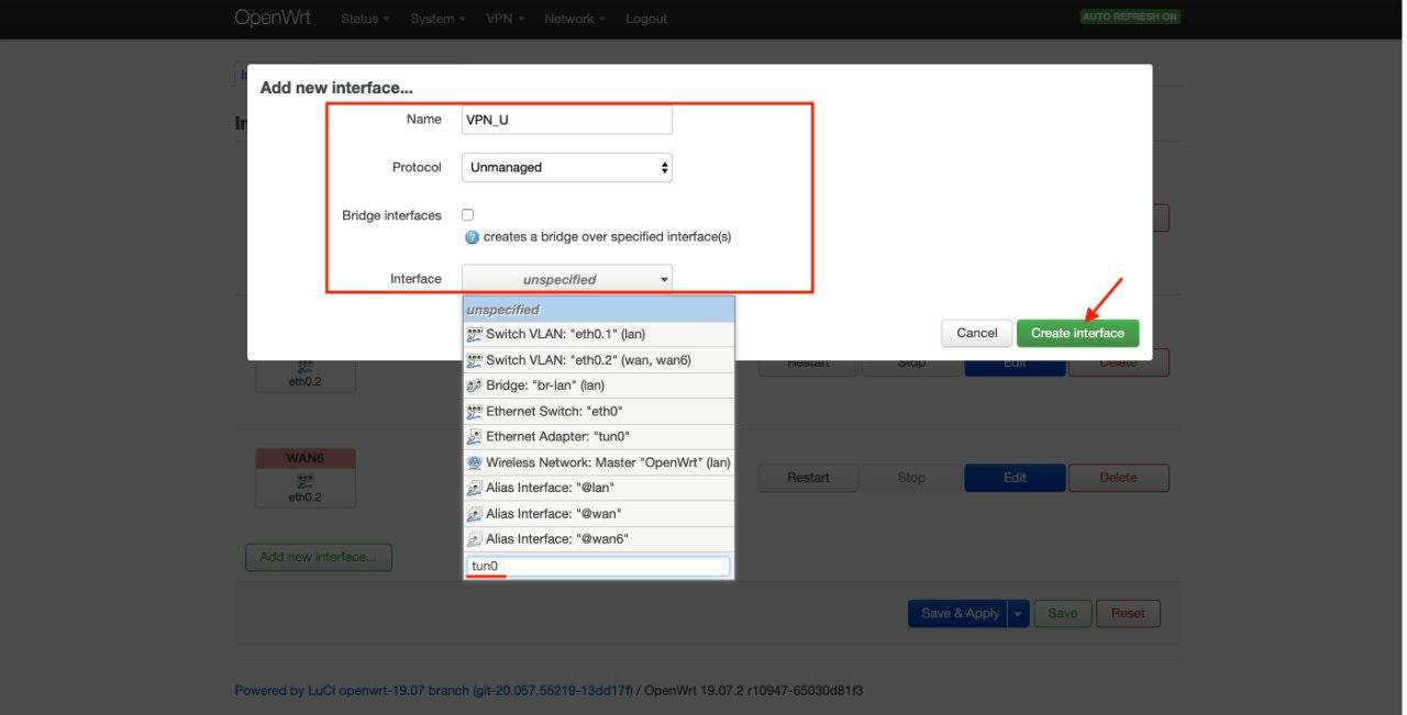 - Interface: Benutzerdefinierte Interface: tun0