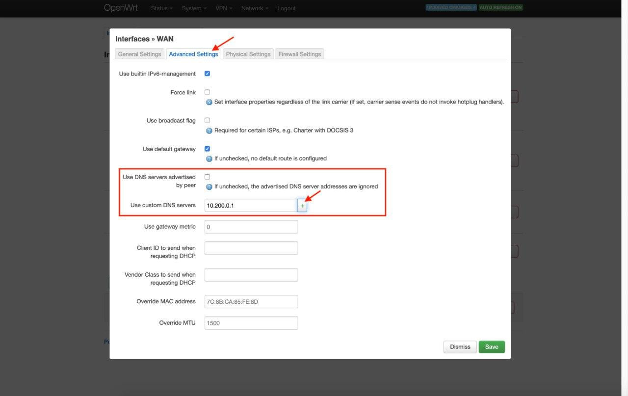6. Navigieren Sie zu WAN > Edit > Advanced Settings (WAN > Bearbeiten > Erweiterte Einstellungen). Deaktivieren Sie den Use DNS servers advertised by peer Parameter (DNS-Server verwenden, die von der Peer-Parameter beworben werden), und setzen Sie den Wert 10.200.0.1 für Use custom DNS server (Benutzerdefinierten DNS-Server) verwenden. Drücken Sie die Taste +.