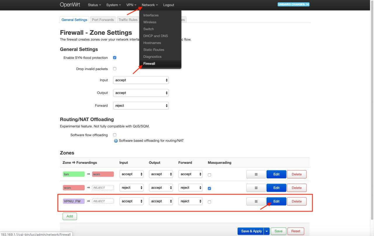 11. Gehen Sie zu Network > Firewall (Netzwerk > Firewall), wählen Sie VPNU_FW und klicken Sie auf Edit (Bearbeiten).