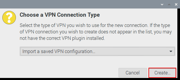 5. Seleccione Import a saved VPN configuration... (Importar una configuración de VPN guardada…) y presione el botón Create (Crear)...