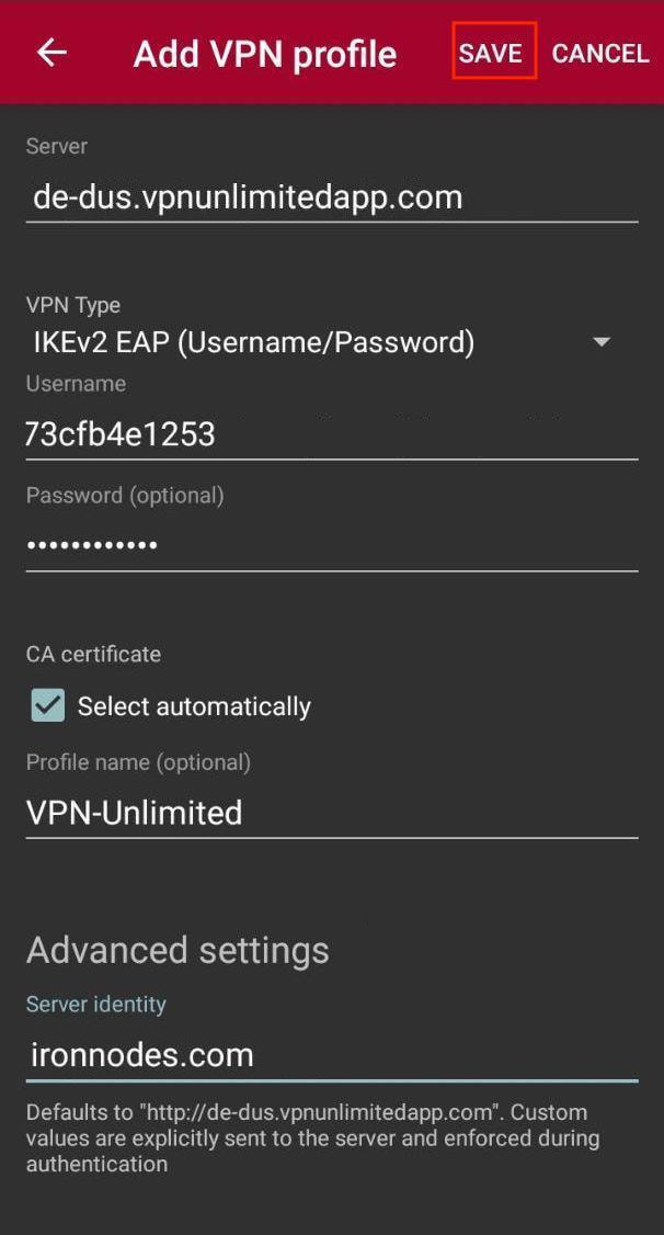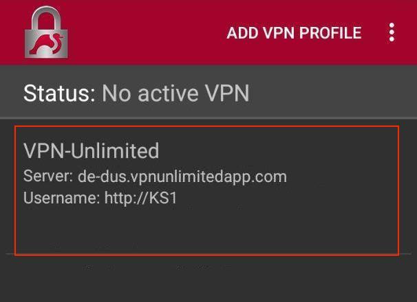 Profile name: enter the desired connection name, for example, VPN-Unlimited
