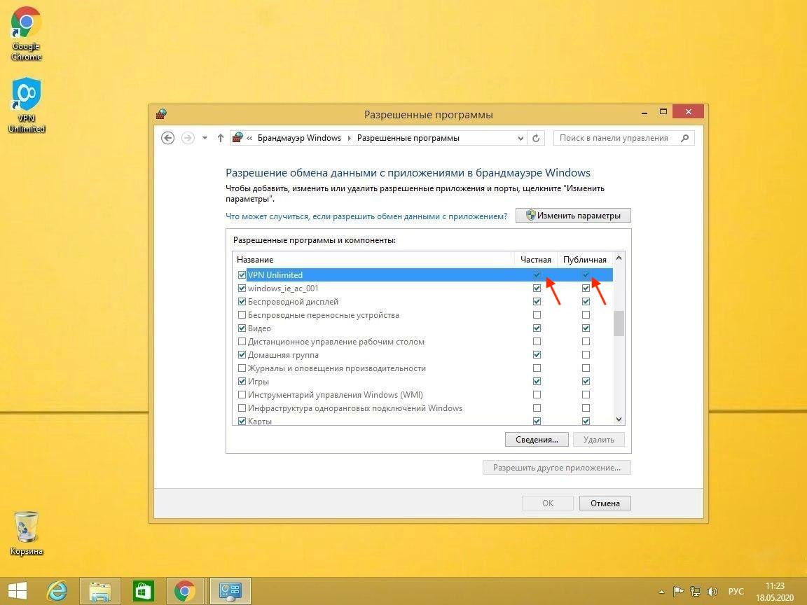 Найдите в списке приложений VPNUnlimited и нажмите кнопку Изменить параметры. Установите оба флажка и нажмите кнопку ОК.