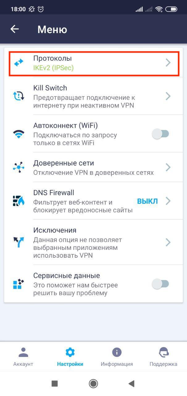 3. Откройте вкладку Настройки и выберите пункт Протоколы.